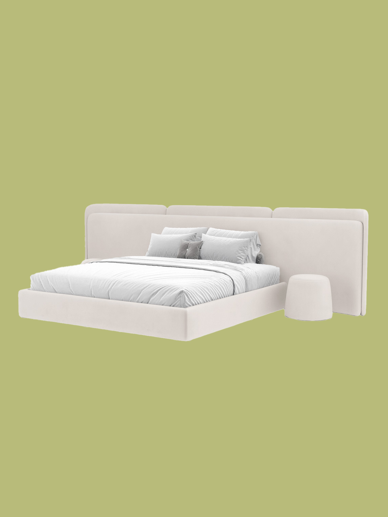 Современная кровать с широким мягким изголовьем, дополненная пуфом в том же стиле, идеально впишется в просторную спальню. Светлая обивка подчёркивает минималистичный характер модели. Каркас изготовлен из высококачественной древесины и рассчитан на ежедневное использование.