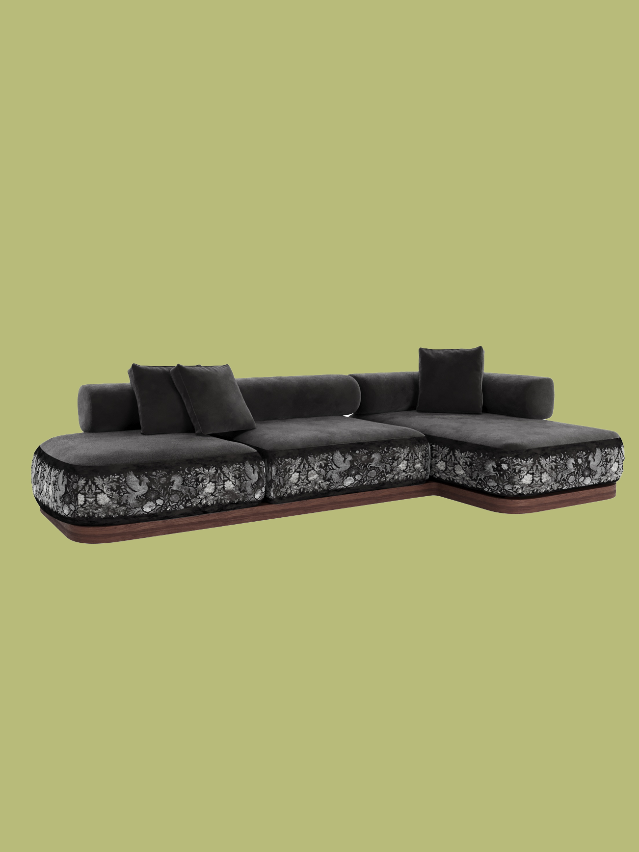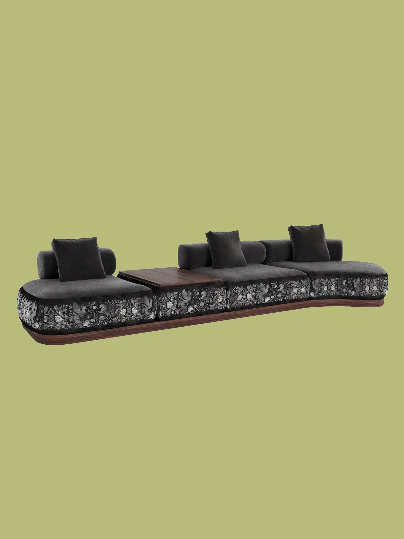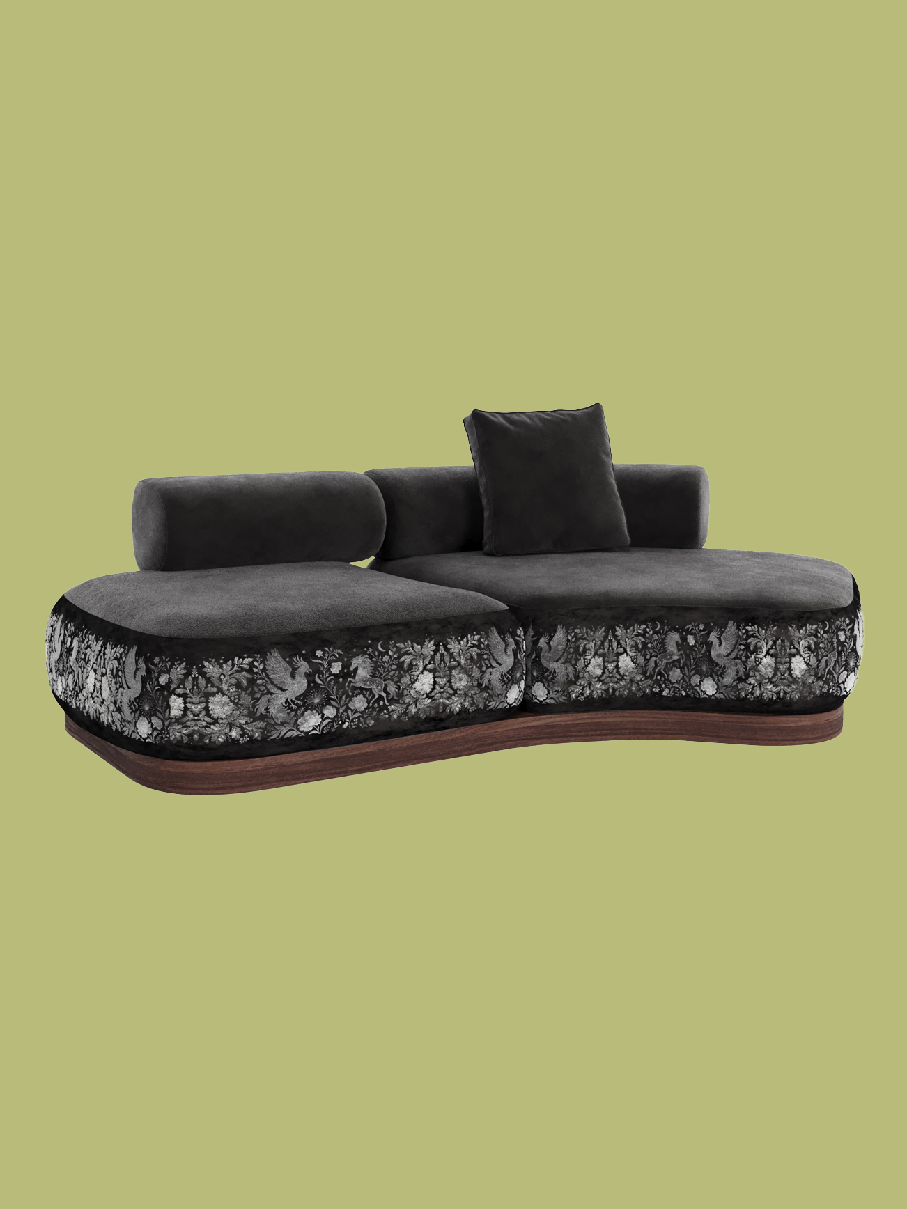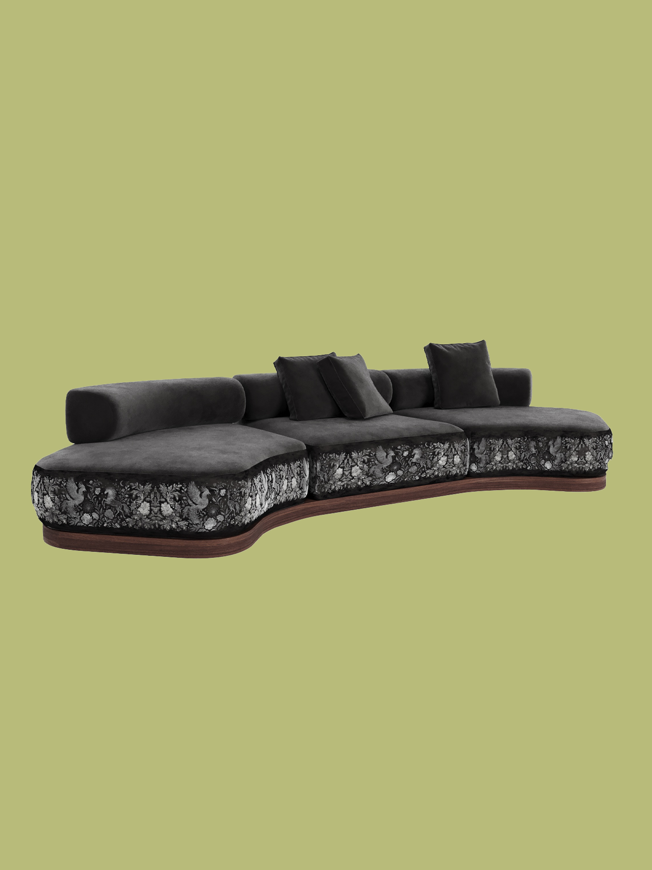 Диван «Сказка» — выставочная модель с модульной конструкцией, выполненная в велюровой отделке с вышивкой ручной работы. Эргономичные модули обеспечивают комфортную посадку, а прочный каркас гарантирует долговечность. Доступен под заказ в любом цвете и по индивидуальным размерам, что позволяет адаптировать модель под конкретный интерьер.