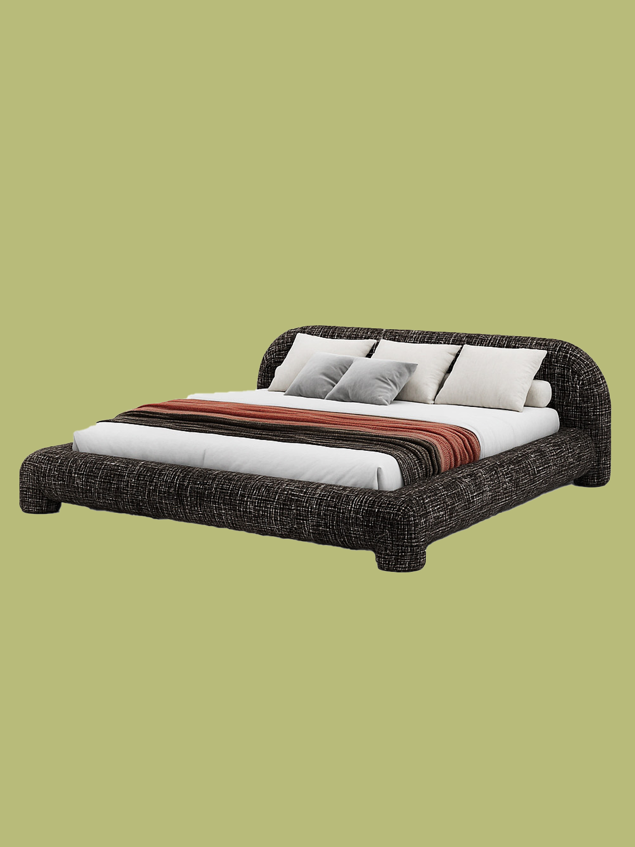 Низкая кровать с плавными формами и глубокой обивкой создаёт расслабленную атмосферу в спальне. Тёмная ткань делает модель выразительным акцентом в интерьере. Каркас усилен для сохранения устойчивости даже при большой нагрузке.