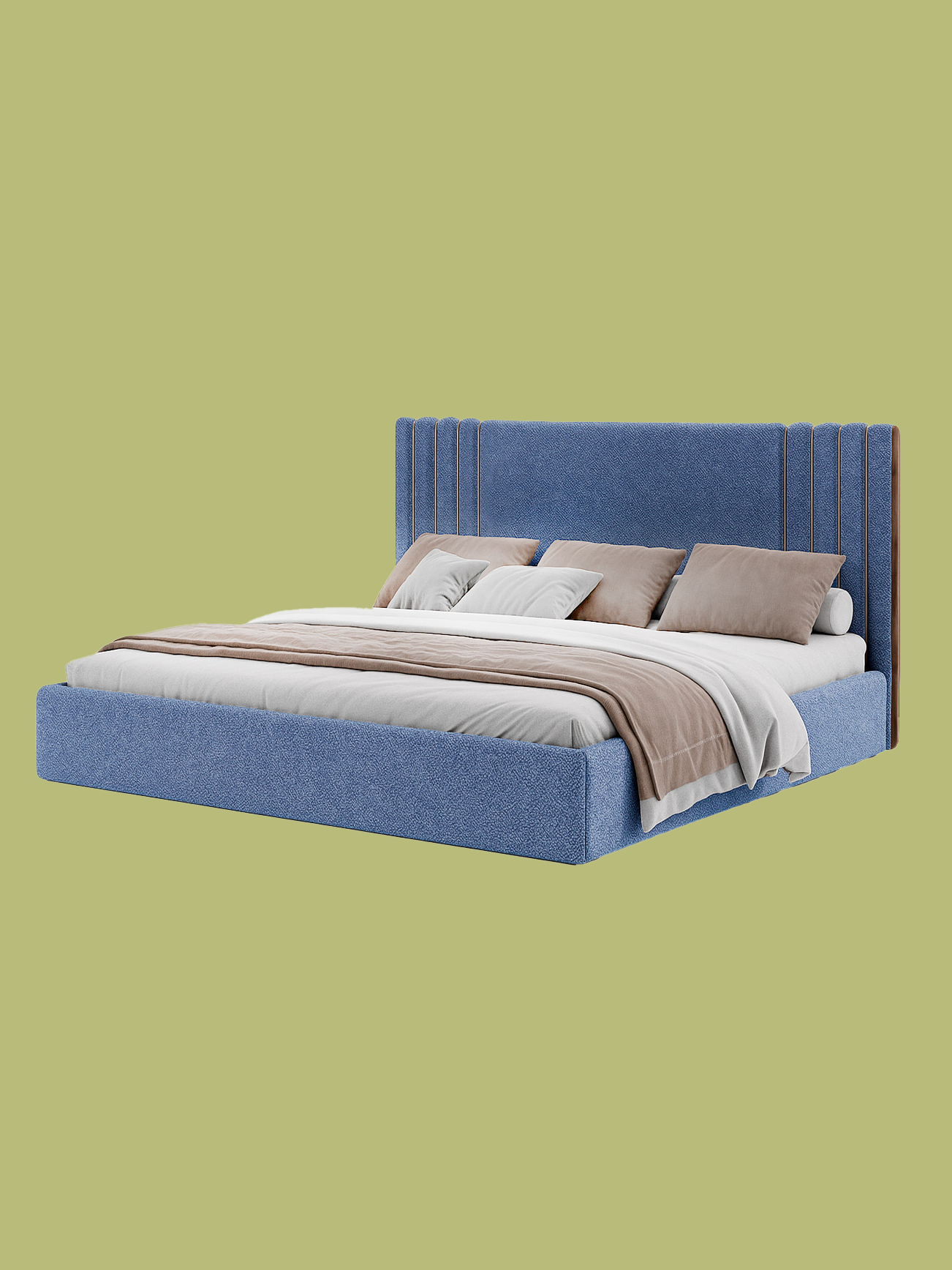 Кровать с высоким изголовьем и декоративными вертикальными вставками сочетает современный дизайн и практичность. Синяя обивка добавляет интерьеру свежести и индивидуальности. Каркас выполнен из прочных материалов, обеспечивающих надёжность и долгий срок службы.